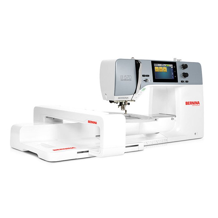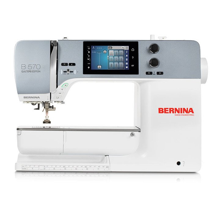 Machine à coudre et broder BERNINA 570QE avec bras libre 215 mm, écran tactile couleur, coupe-fil automatique et Dual Feed. Parfaite pour le quilting.